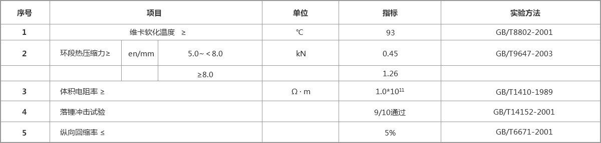 PVC-C樹脂為母料,該產(chǎn)品具有強度高、柔韌性好、耐高溫、耐腐蝕、阻燃、絕綠性能良好、不易老化、質(zhì)輕、施工方便等特點,其各項性能指標(biāo)經(jīng)國家級、省檢測、鑒定和認(rèn)證,均已達到或超過國內(nèi)的同類產(chǎn)品水平。產(chǎn)品性能大優(yōu)于傳統(tǒng)的石棉電纜排管及普通PVC管材,是傳統(tǒng)電力電纜護套管的理想替代品。